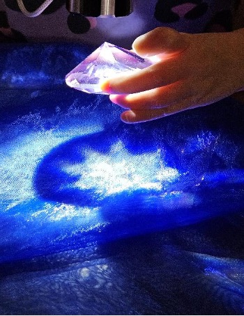 Prepare the space by setting out the planned stimuli: handheld and table lamps, an overhead projector, a light table, transparent materials (foils and fabrics), coloured glass pebbles, transparent PVC geometric shapes, kitchen utensils with holes (such as colanders of different sizes), circular cardboard shapes and/or CDs, coloured cellophane, scissors, glue, mobile phones, and cameras.
