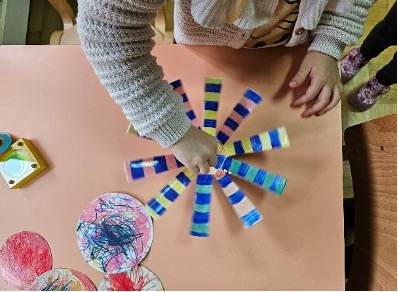 As an additional art stimulus, offer collage paper, fluorescent acrylic paints (glow-in-the-dark), pre-cut cardboard in other shapes, small coloured pompoms, glue, and similar materials. You can also organise an optical toy workshop for children and parents.