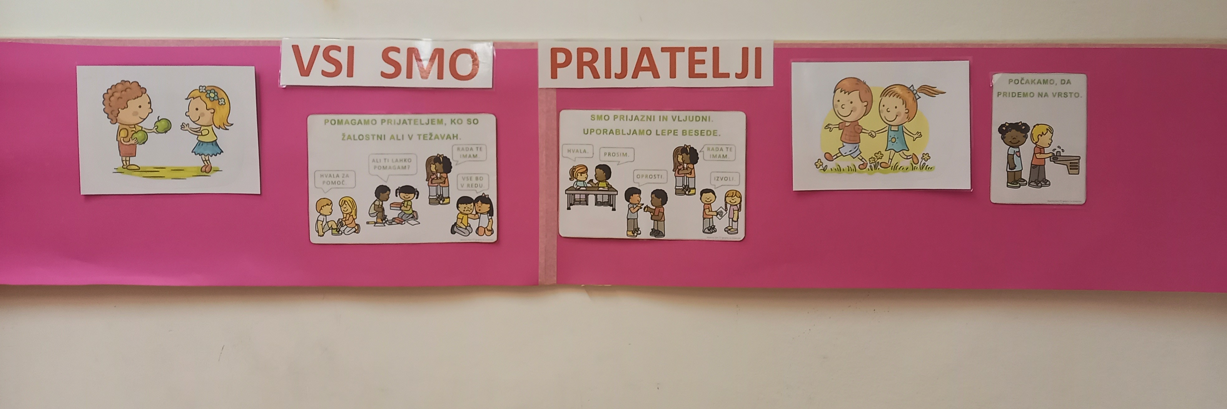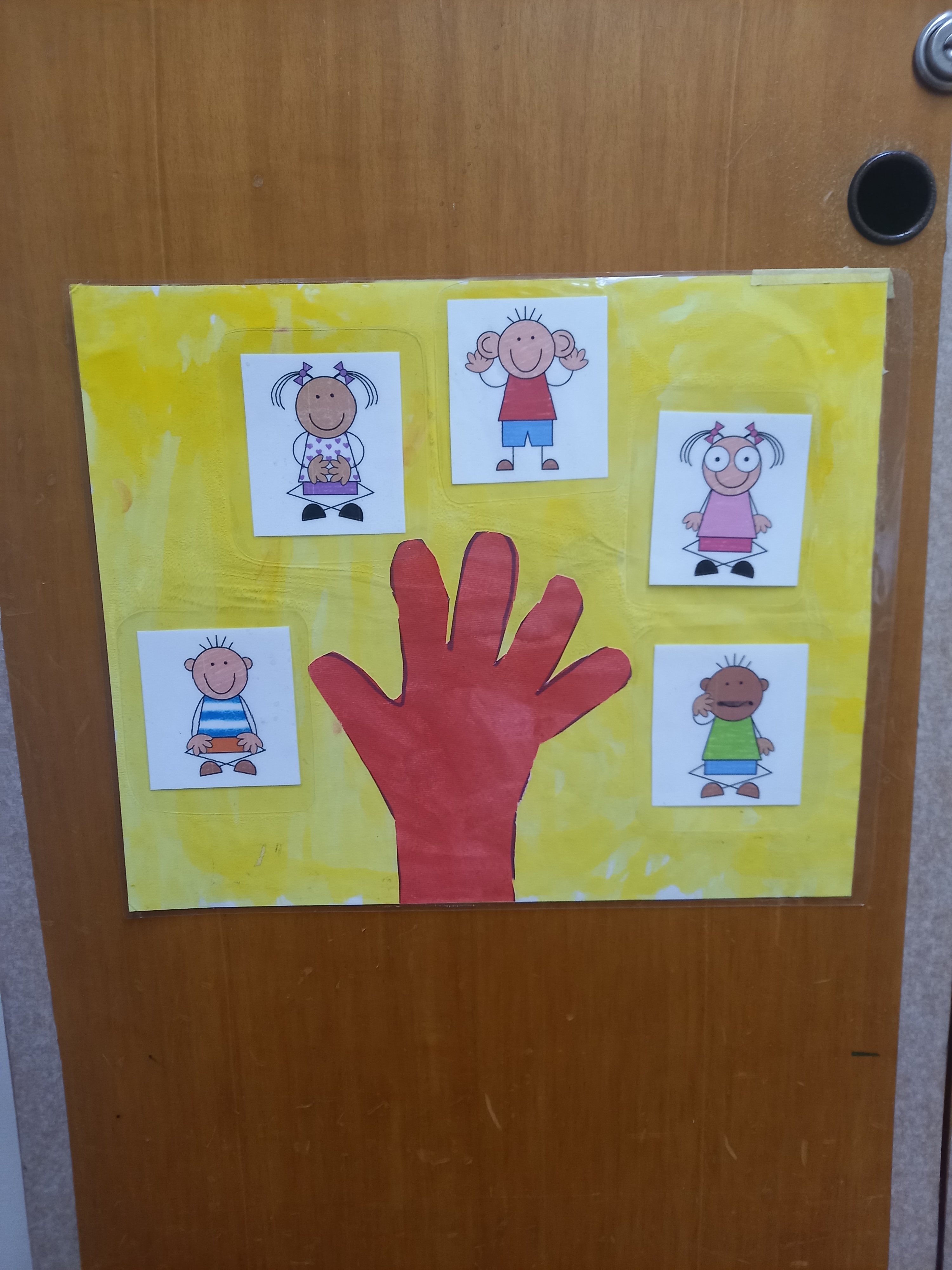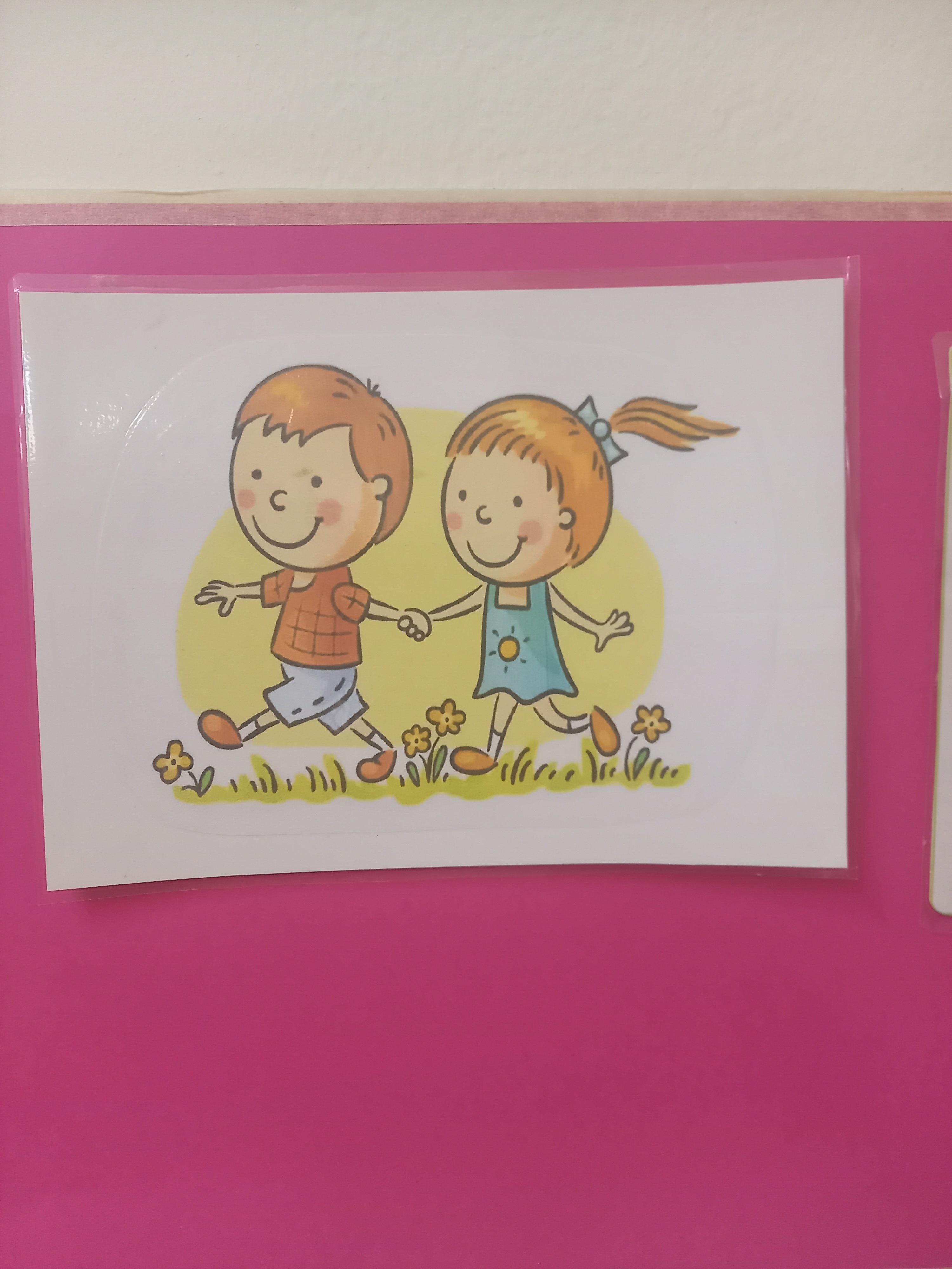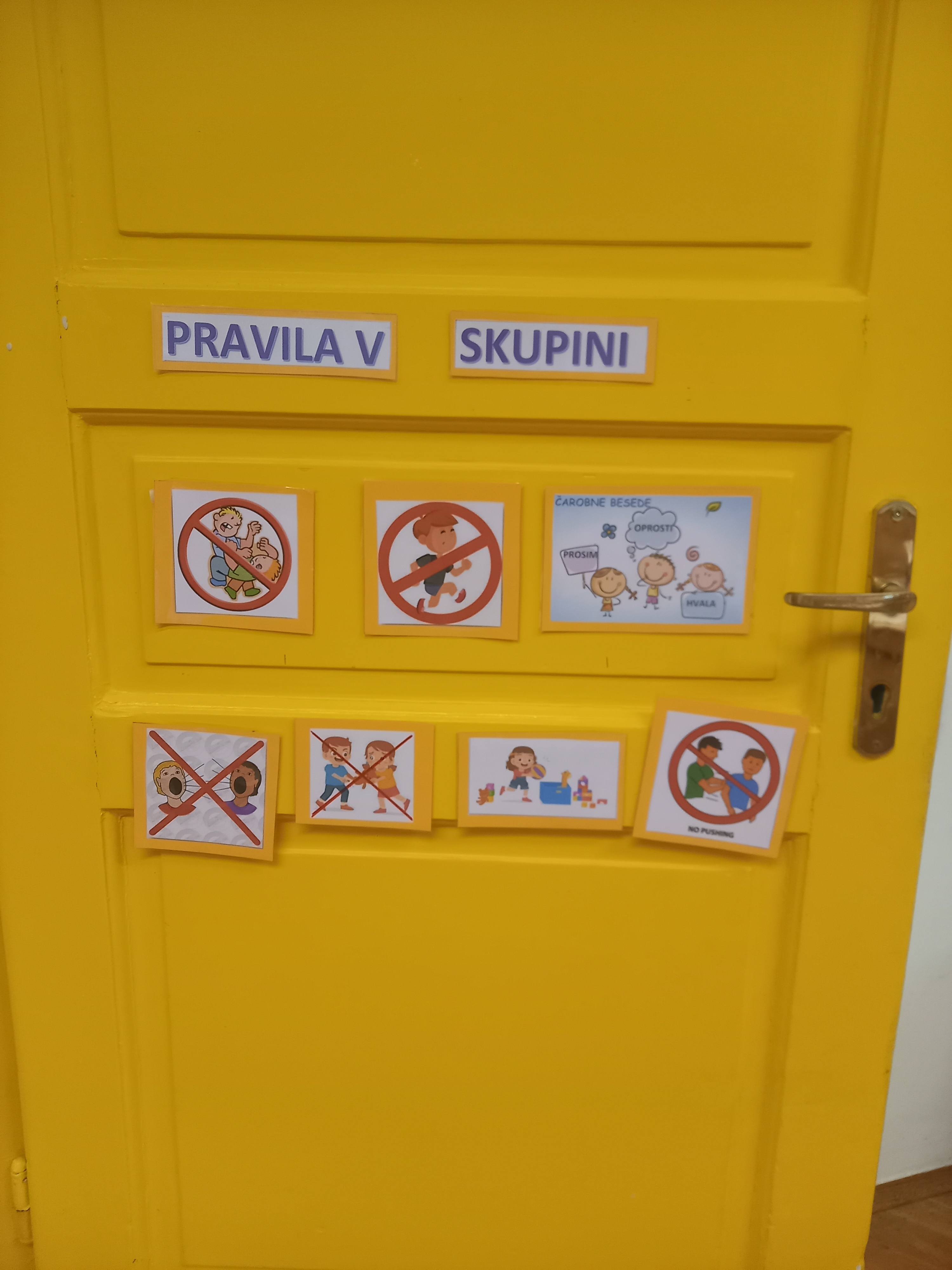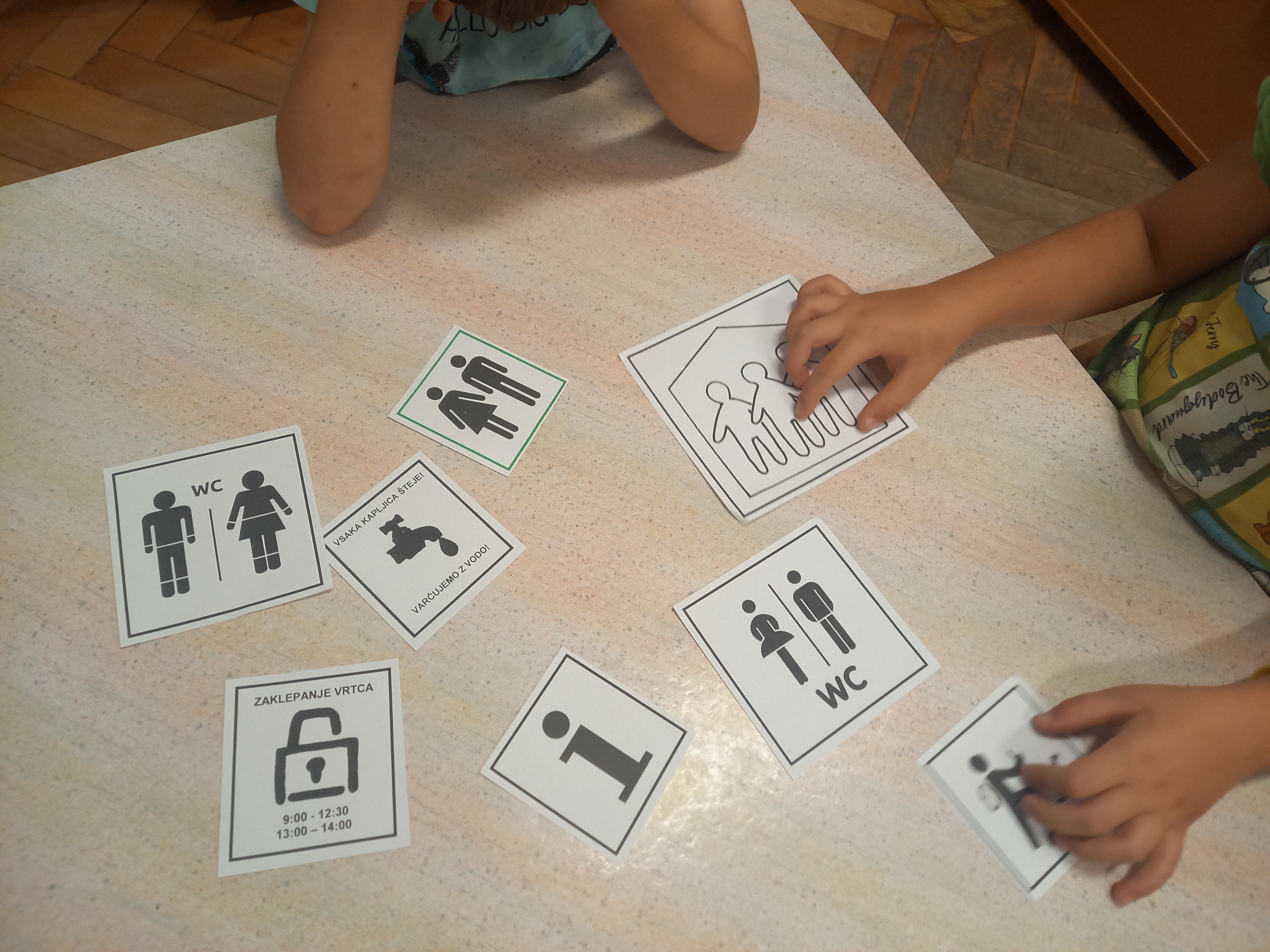 Children suggest where the signs should be placed so that they are clearly visible to everyone, for example on the classroom wall or on the door. They choose suitable signs and attach them to the walls and doors in the playroom.