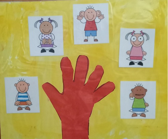 The teacher asks the children how and with what we listen. Together with the children, the teacher revises the five elements of active listening: sitting calmly, hands next to the body, ears listening, eyes watching the speaker, mouths closed.